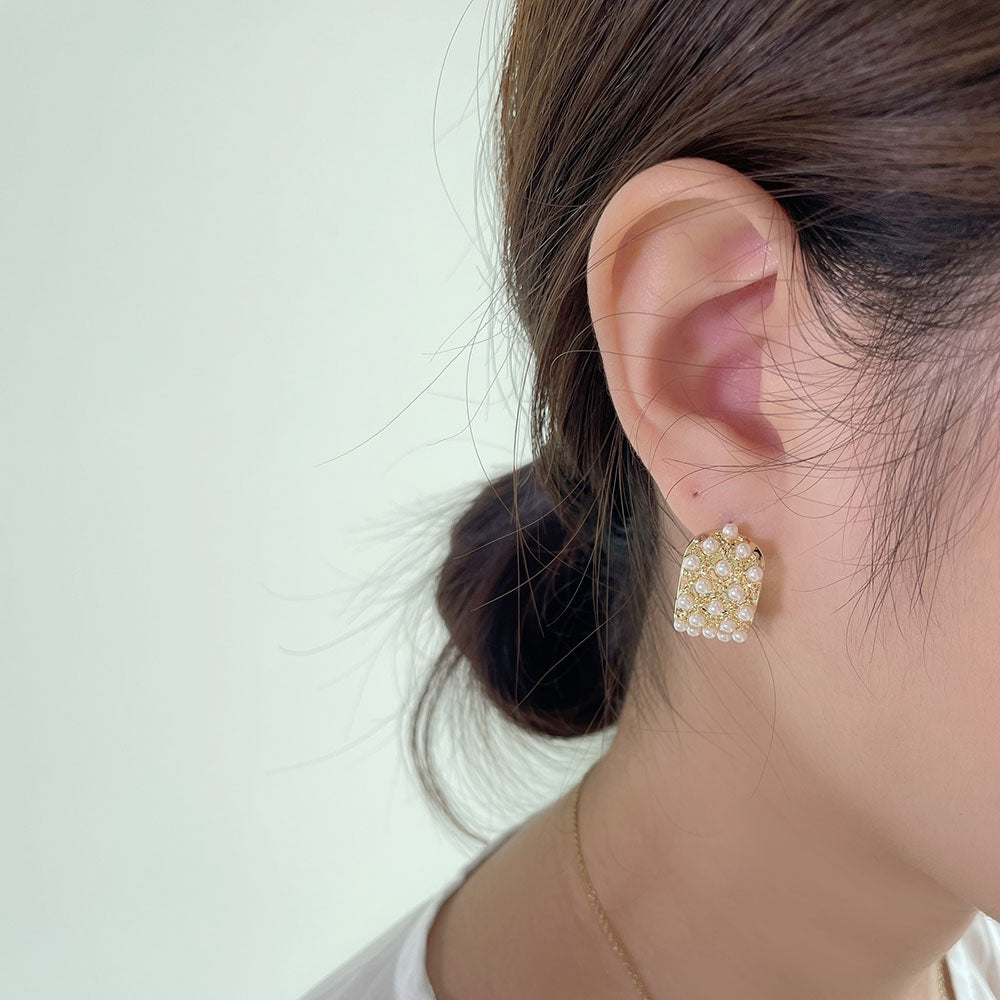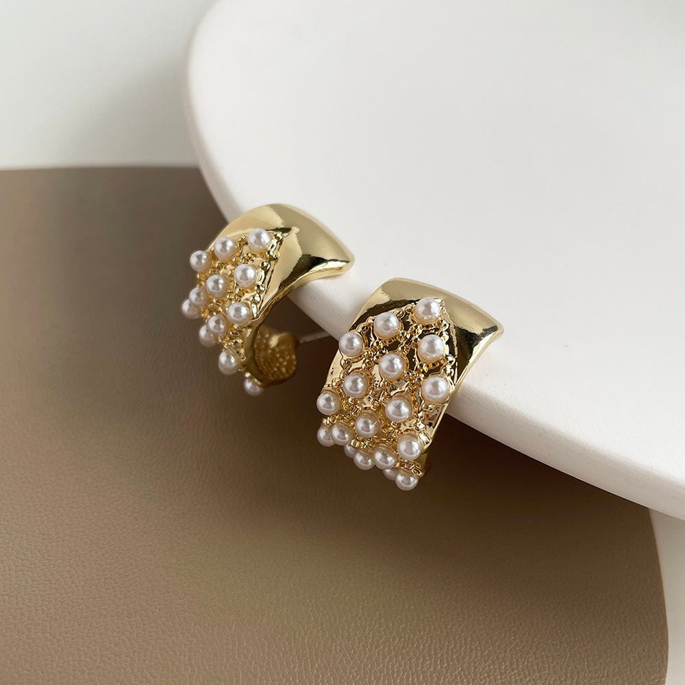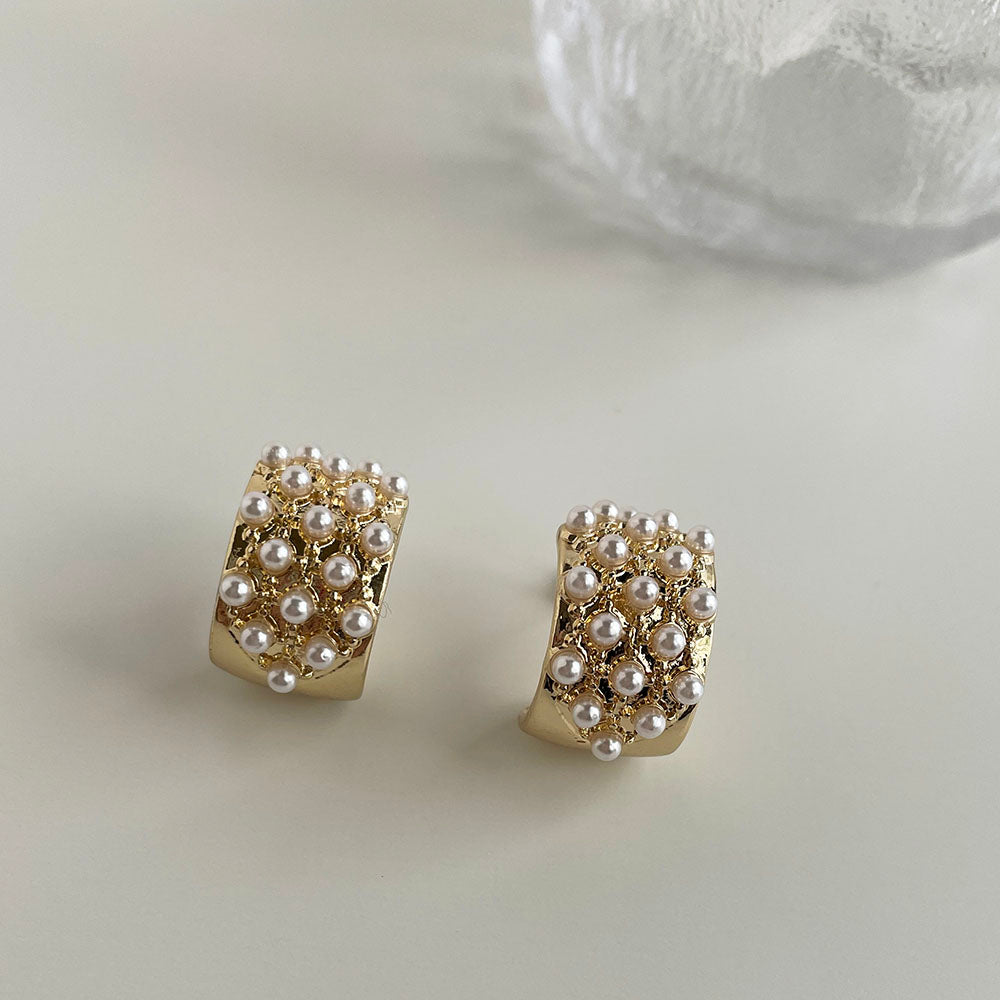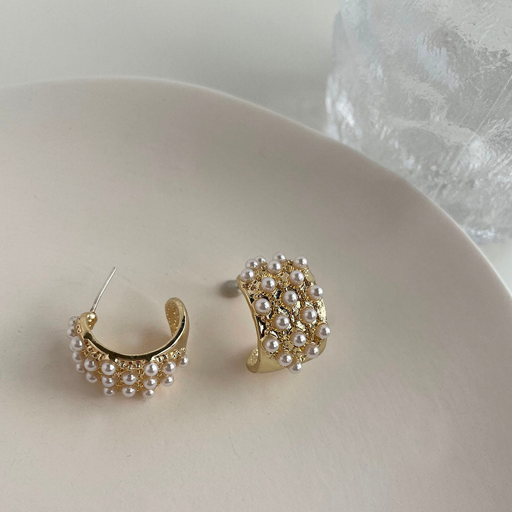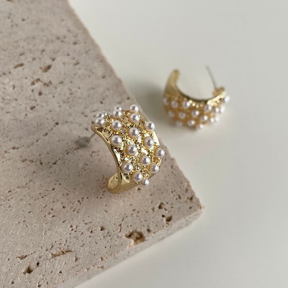 鑲滿珍珠C形耳環 - 925純銀針