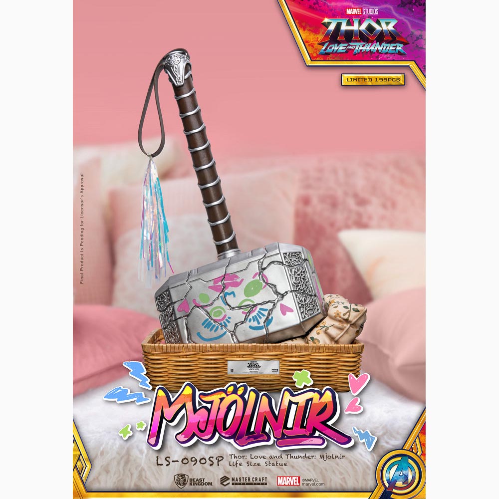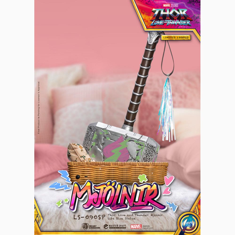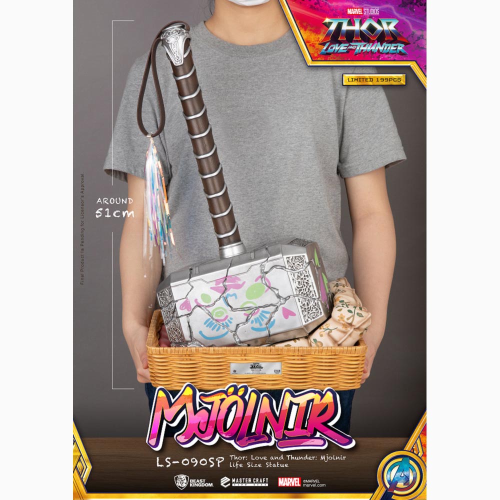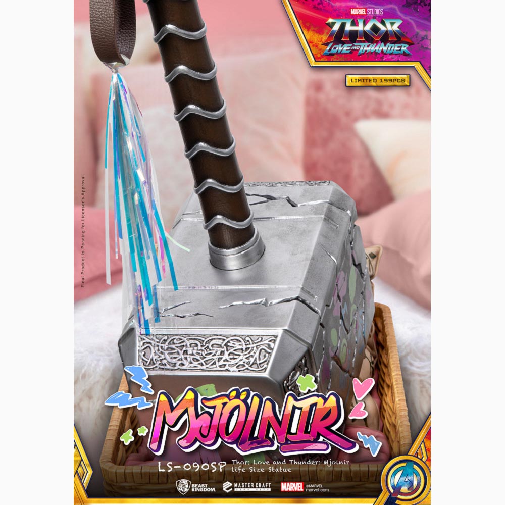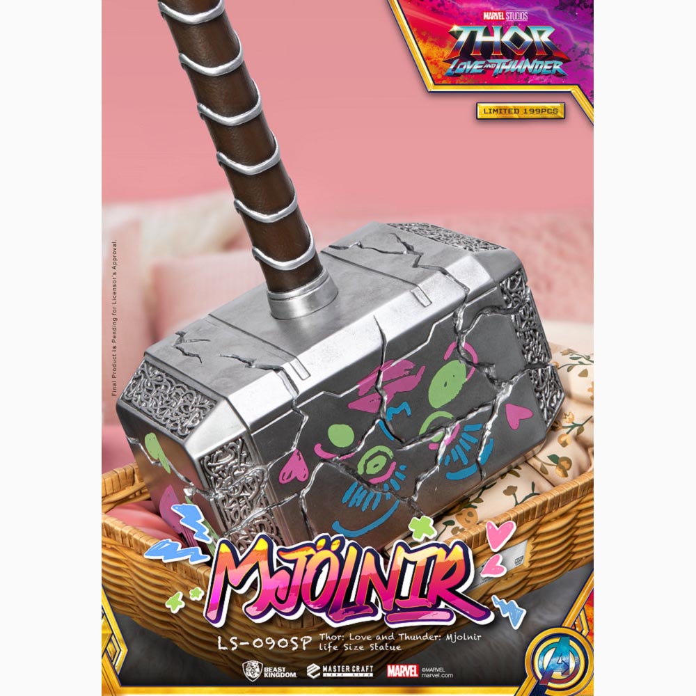 考究電影中Love在索爾的槌子上塗鴉的版本推出1:1雕像,除了將鎚子的立體雕紋、裂痕紋理、手柄的細節一一還原外,槌子上的塗鴉及流蘇也再現啦!搭配Love專為Mjolnir準備的竹編小床為地台,仔細一看還有棉被跟枕頭~當然也少不了Mjolnir的發光效果,可以閃耀出如閃電般的藍色光芒,全球極限量199尊的雷神槌收藏品,身為喜愛漫威的重度收藏迷絕不可錯過!